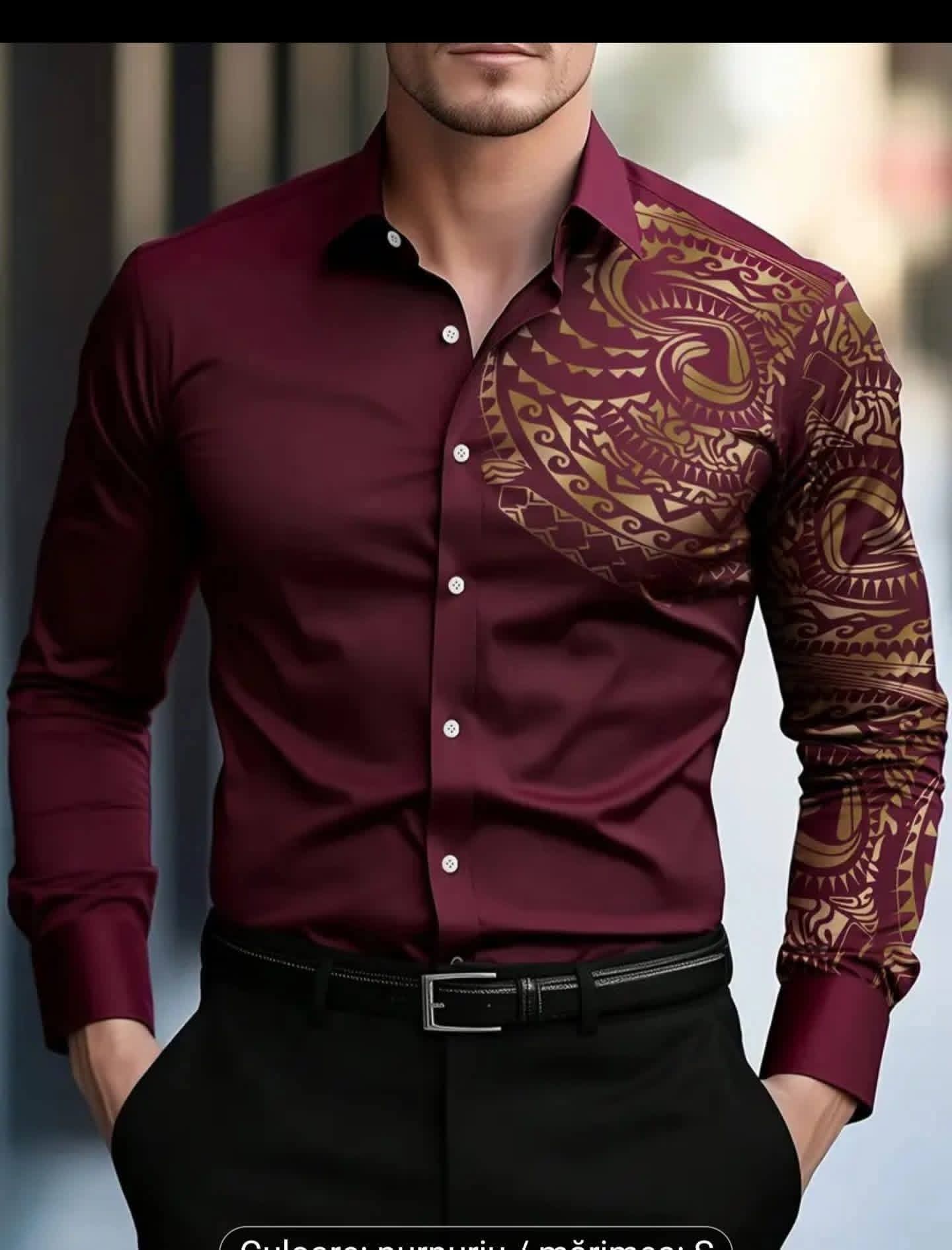 Adaugă o notă de rafinament și originalitate garderobei tale cu această cămașă bărbătească elegantă în nuanță grena, decorată cu un model tribal auriu pe umăr și pe mâneca stângă. Realizată dintr-un material de calitate superioară, fin la atingere și confortabil pe piele, această cămașă îmbină perfect stilul clasic cu accente moderne și îndrăznețe.