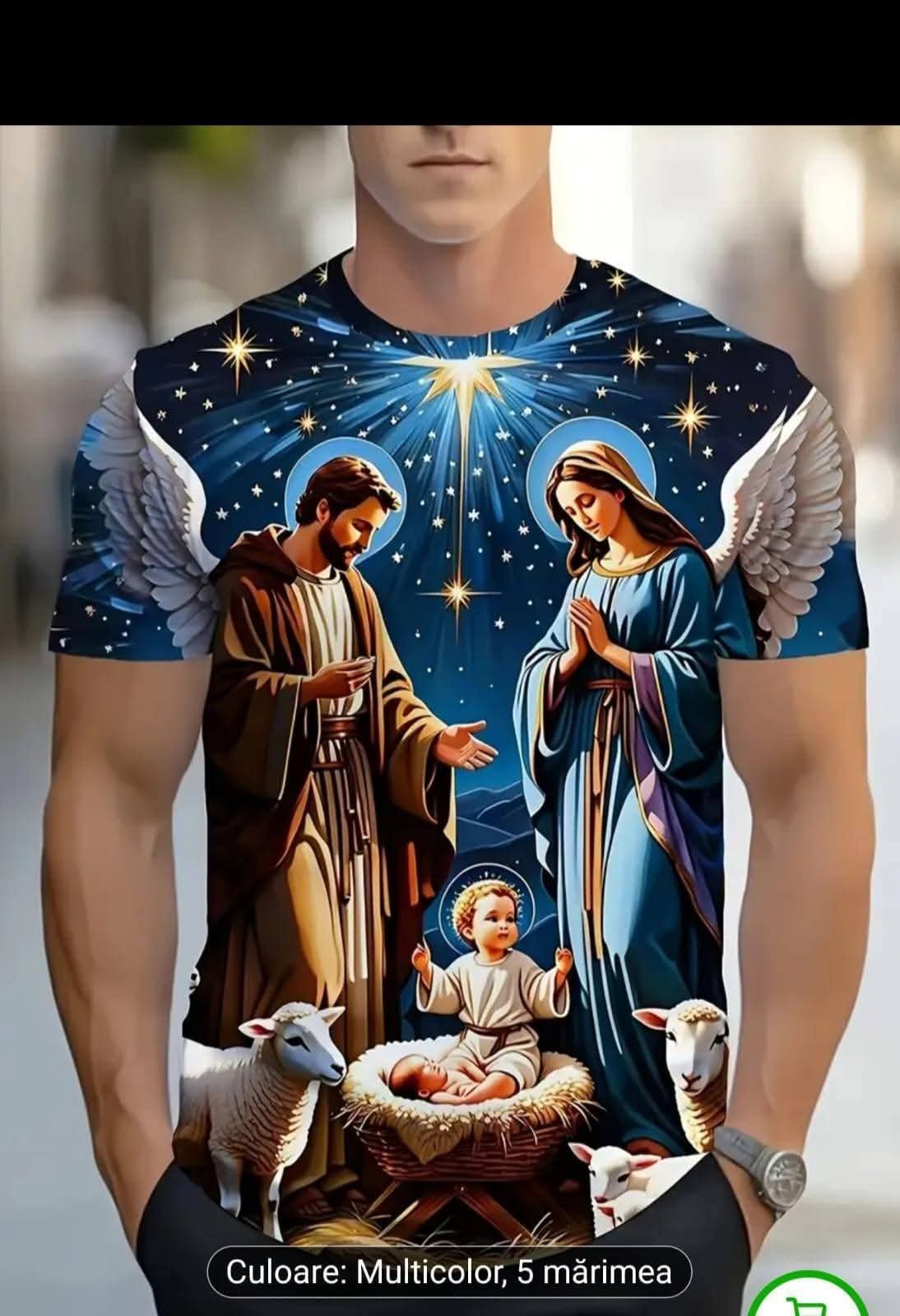 - Elemente Adiacente: Pe umerii și mânecile tricoului sunt imprimate aripi mari, albe, de înger. La baza tricoului sunt reprezentate oișoare (miei) stând în jurul ieslei.